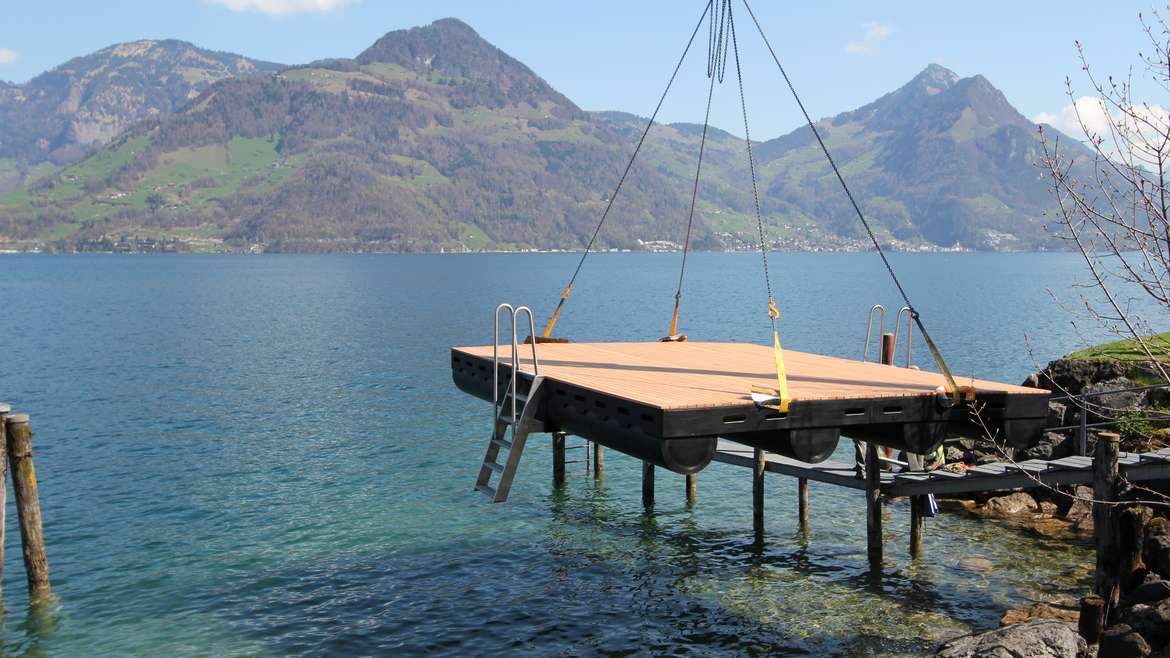 Es dauerte nicht lange bis auswärtige Gäste von unserem Bade-Floss begeistert waren und das Strandbad Lido Luzern die grössere Ausführung bei uns bestellte. Die grösste Herausforderung bei diesem Projekt war der Transport von der Werkhalle Emmetten bis nach Beckenried. Das Floss erhielt auf dieser Strecke Polizei Escort. Anschliessend wurde es über den See ins Lido Luzern gezogen.